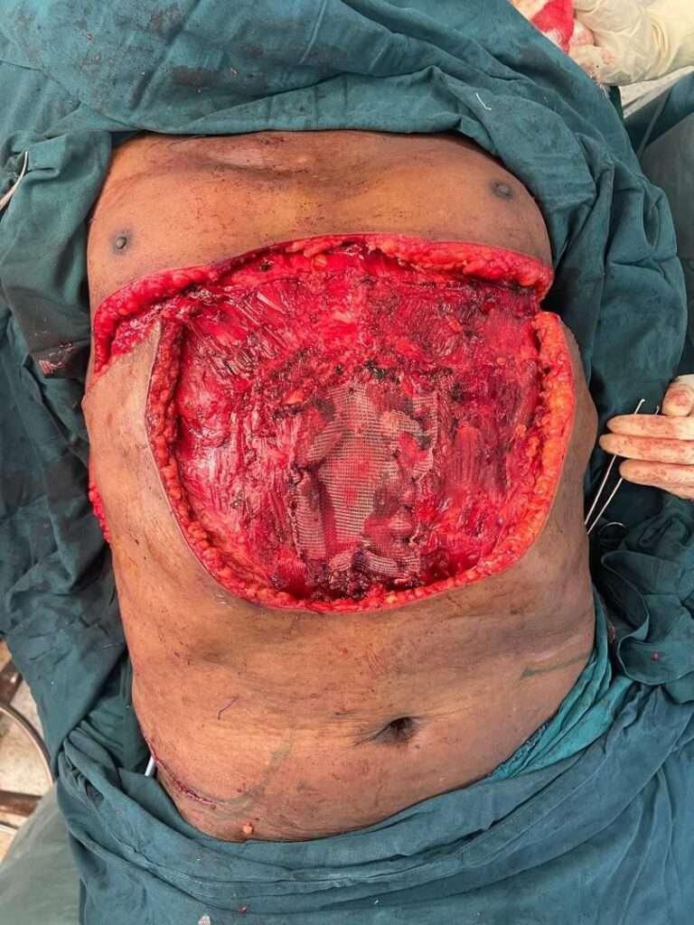 Excised full thickness skin up to parts of rectus abdomens creating defect about 25 to 30cm of lower chest wall exposing lower sternum lower ribs and upper abdominal wall exposing intraabdominal organs.